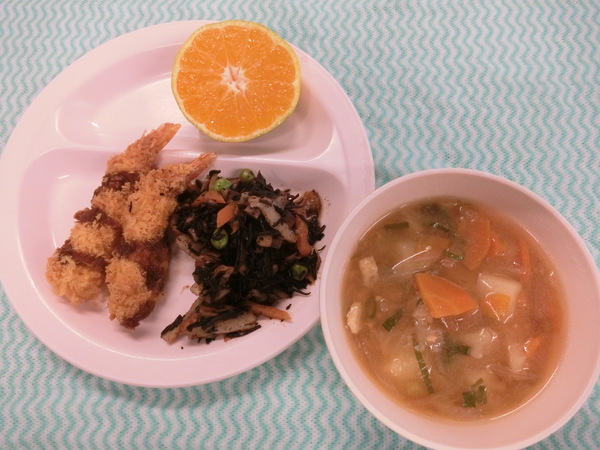 給 食 エビフライ ひじきの煮物 おみそ汁 みかん