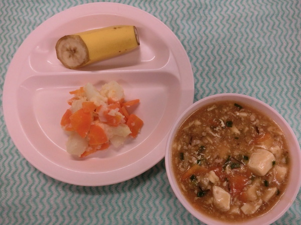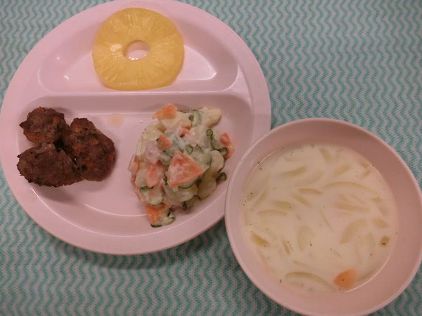 給 食 ひき肉のまり焼き マセドアンサラダ ミルクスープ パイン缶