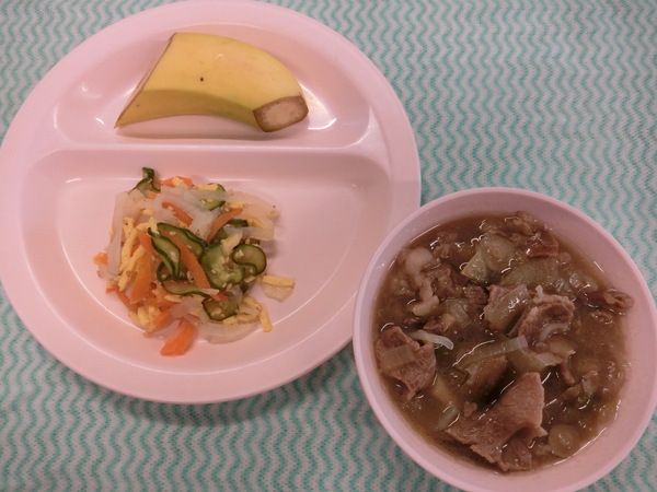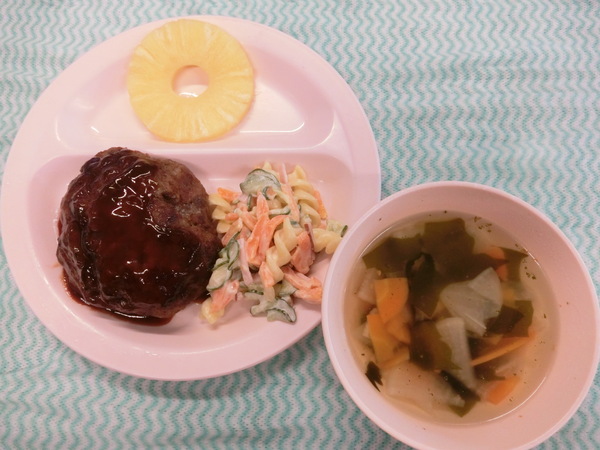 給 食 ハンバーグ マカロニサラダ 野菜スープ パイン缶