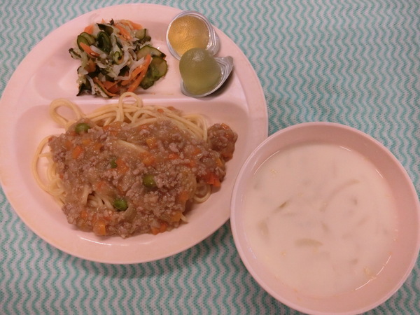 給 食 肉みそスパゲティ 和風サラダ コーンスープ ミニゼリー