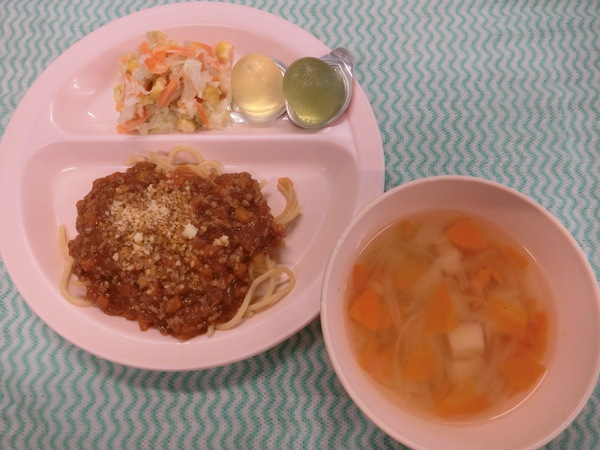 給 食 ミートソーススパゲティ コールスロー コンソメスープ ミニゼリー