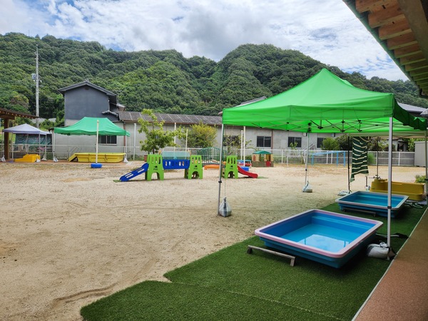 水あそびは園児の体調やWBGTなどに気を付けながら、シャワーとプールを安全に楽しんでいます。